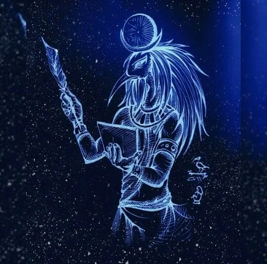 In art, Thoth was usually depicted with the head of an ibis, deriving from his name, and the curve of the ibis' beak, which resembles the crescent moon. Thoth the Scribe, wrote the story of our reality then placed it into grids for us to experience and learn through the alchemy of time and consciousness.